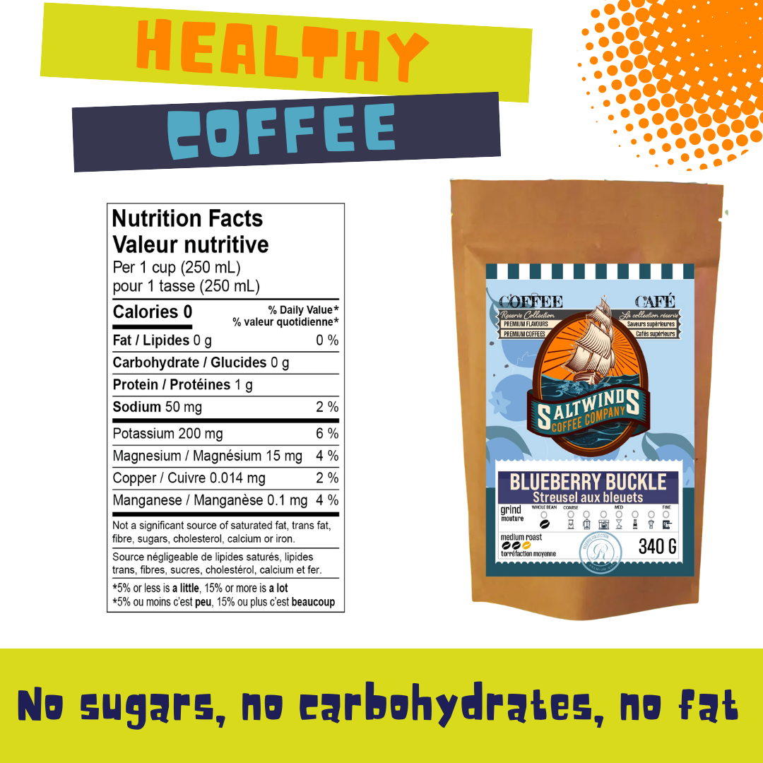 Blueberry buckle is a Maritime favourite with its coffee cake like base and crumbly streusel topping. The aroma of our blueberry buckle flavoured coffee is very inviting and comforting, with a strong waft of freshly brewed coffee mixed with sweet, fruity notes of ripe blueberries. This coffee also carries a hint of warm nut and spices, evoking the essence of the streusel topping. It is also made with all natural flavours.