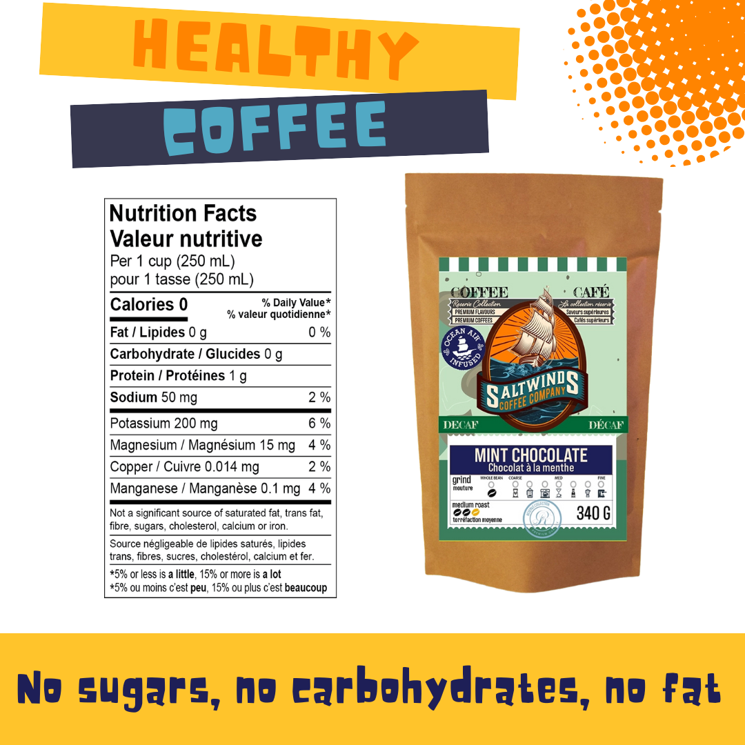 Picture this: the invigorating aroma of freshly ground coffee beans mingling with the irresistible scent of mint and cocoa. With each sip, experience the perfect balance of bold coffee notes harmonizing with the luscious essence of creamy chocolate and a subtle hint of mint. It's a captivating journey for your taste buds, from the first awakening sip to the lingering, satisfying finish. We use a premium organic decaf coffee to elevate the experience even further, and all natural flavourings.