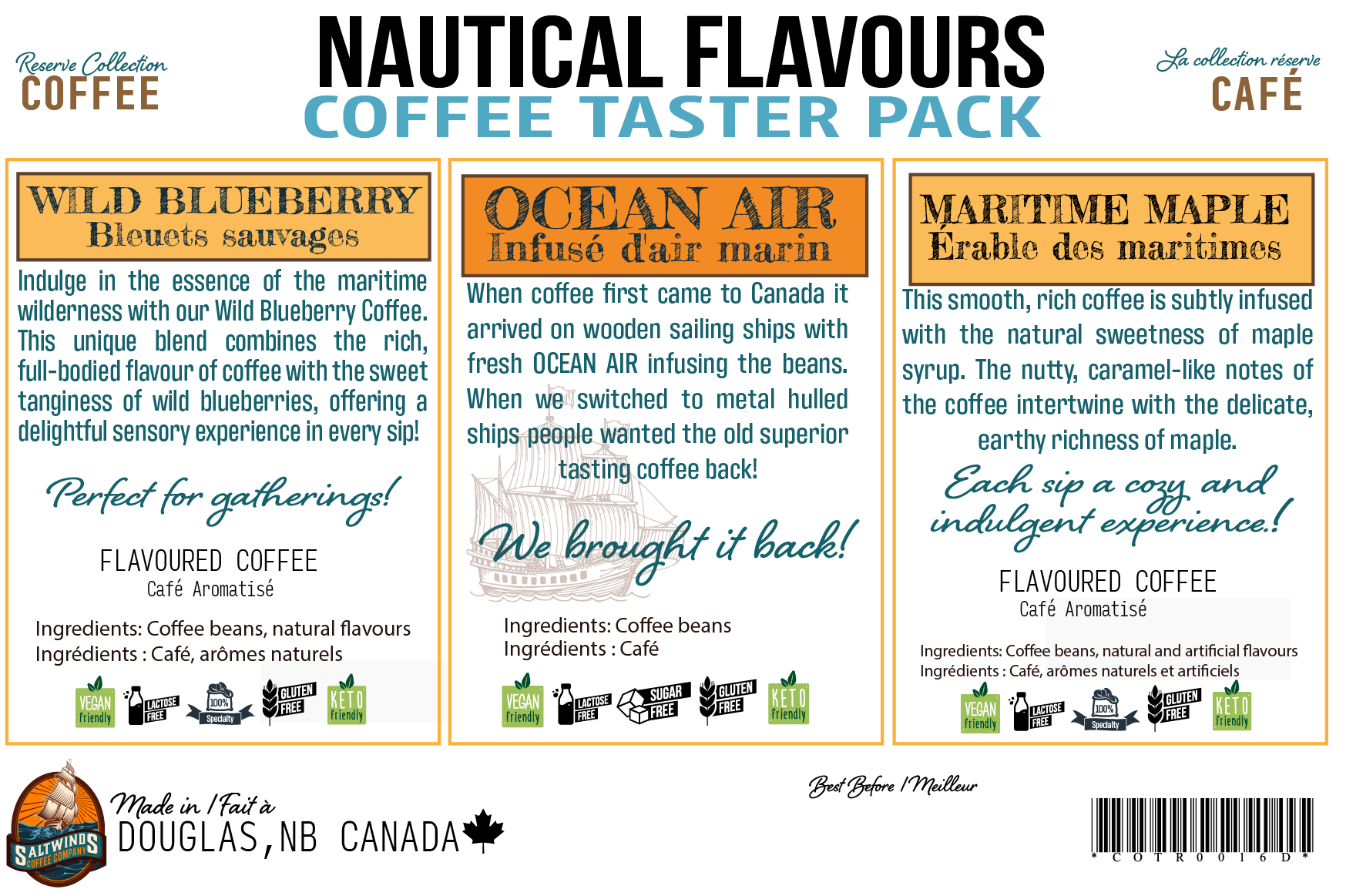 A perfect sized sampler pack of Saltwinds Coffee's unique Maritime blends for the coffee lover in your life - or for yourself! This sampler pack contains Saltwinds' three best selling coffees: the medium roast Captain's Blend, the dark roast Drunken Sailor, and the award winning Ocean Air infused dark roast coffee. With this pack, you get the chance to sample how coffee used to taste when it first came to Canada on wooden sailing ships. In those days, fresh ocean air infused the coffee beans during their voyage, making the coffee smoother and less bitter. When we switched to modern steel hulled container ships, those flavours were lost - until now! The Nautical Taster gift set allows the opportunity to sample the range of Saltwinds coffee blends. Each of the three coffees in this set is packaged individually in a sealed 100g bag, either preground to a medium setting (suitable for a drip machine) or whole bean. Select whether you prefer whole bean or ground when you order. The three bags are decoratively packaged in a white gift box with a clear lid, tied securely with twine. Included in the box is also a descriptive card about Saltwinds Coffee and our unique ocean air infusion process. It's a beautiful set that is ready to gift or enjoy.